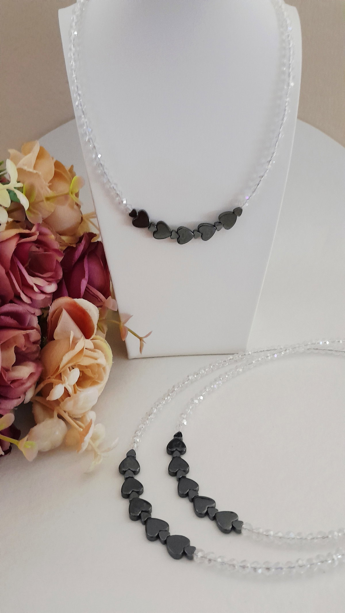 Collar de cristales con centro de piedras Hematite, 40 cm de largo aproximadamente más 5 cm de extensión, cadena y cierre de acero quirúrgico.