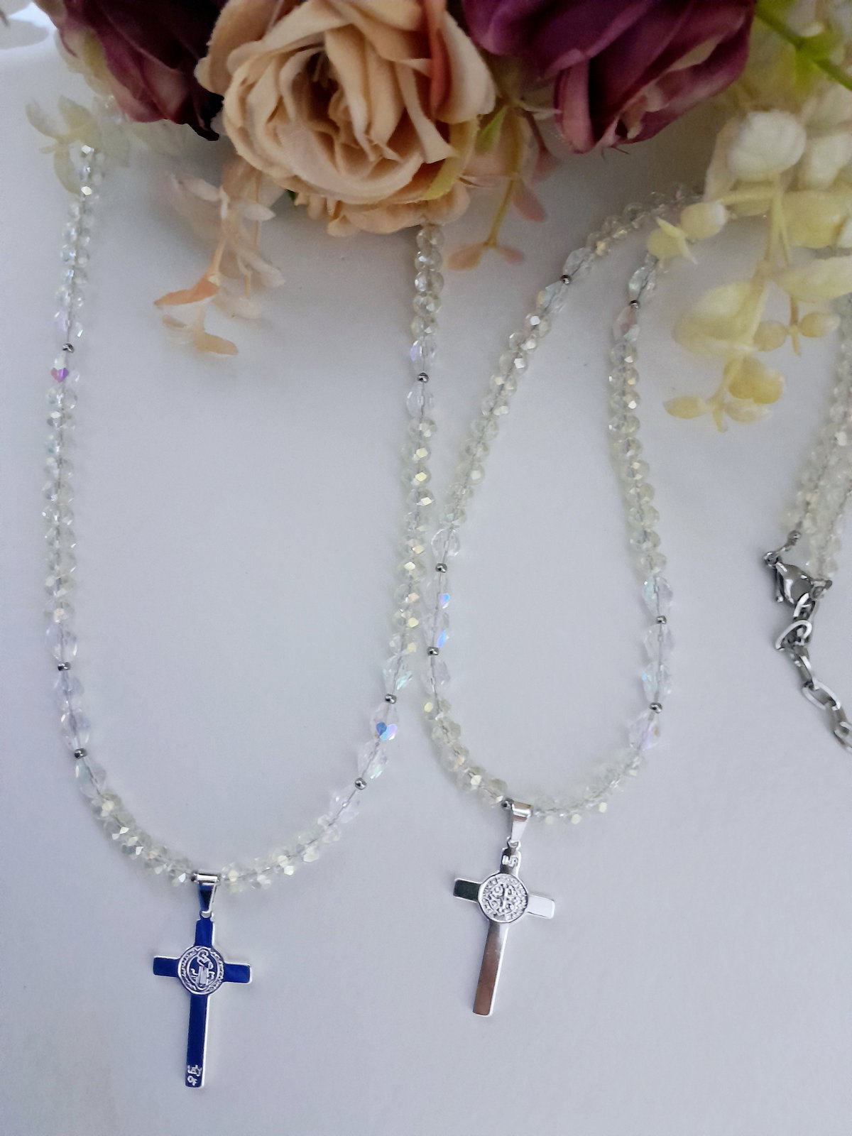 Collar de cristales y dije de acero quirúrgico blanco.