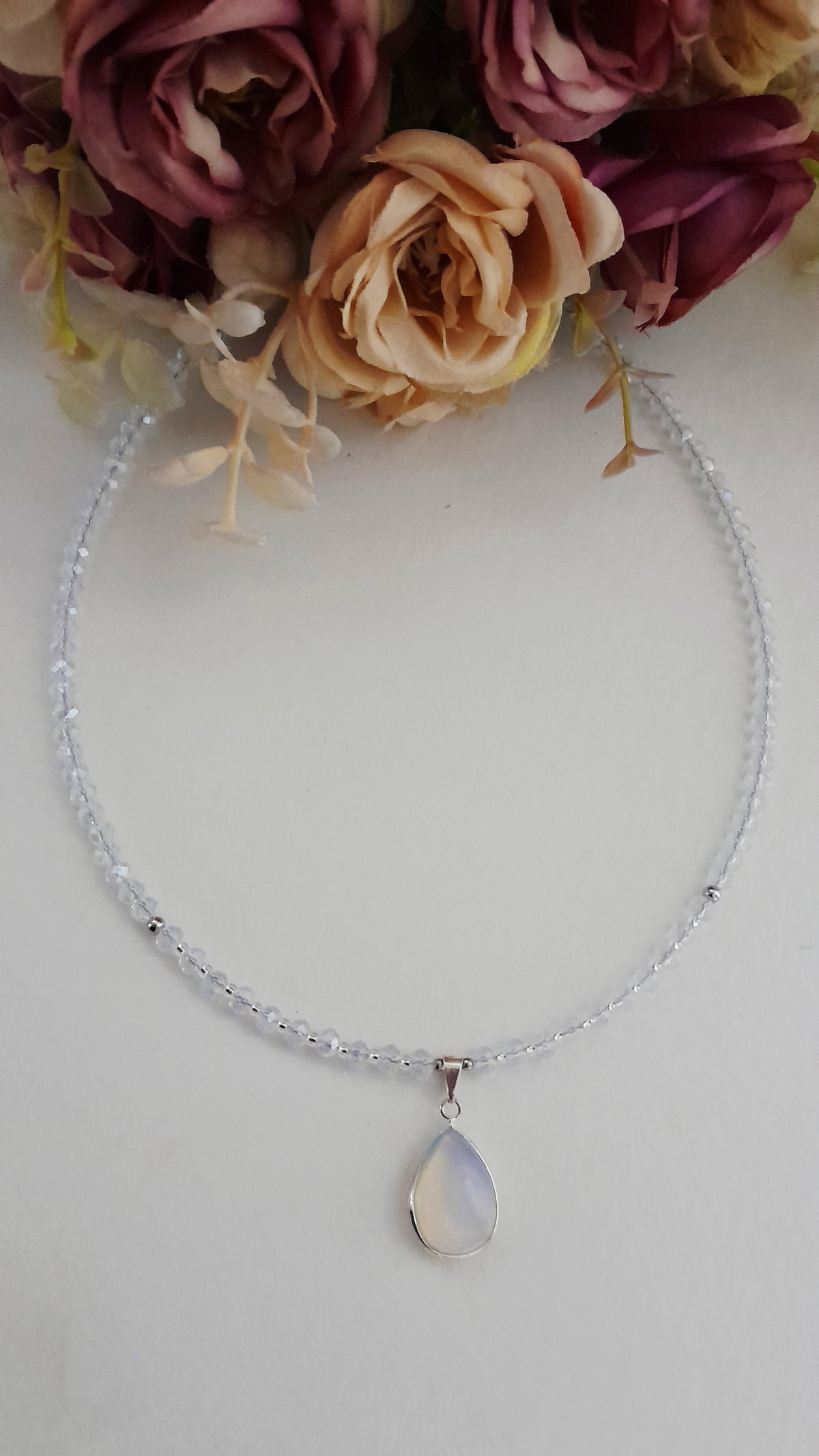 Collar de cristales, esferas de acero quirúrgico, mostacilla calibrada y dije natural de piedra de la luna (engarce con baño de plata), 40 cm de largo (más cadena de extensión de 5 cm), alargue y cierre de acero quirúrgico,