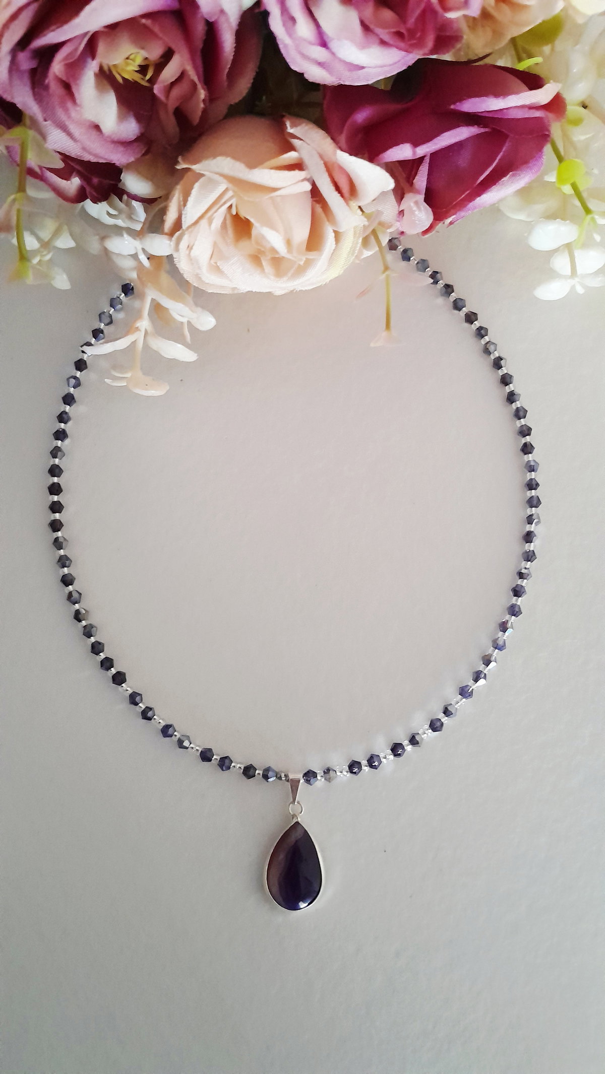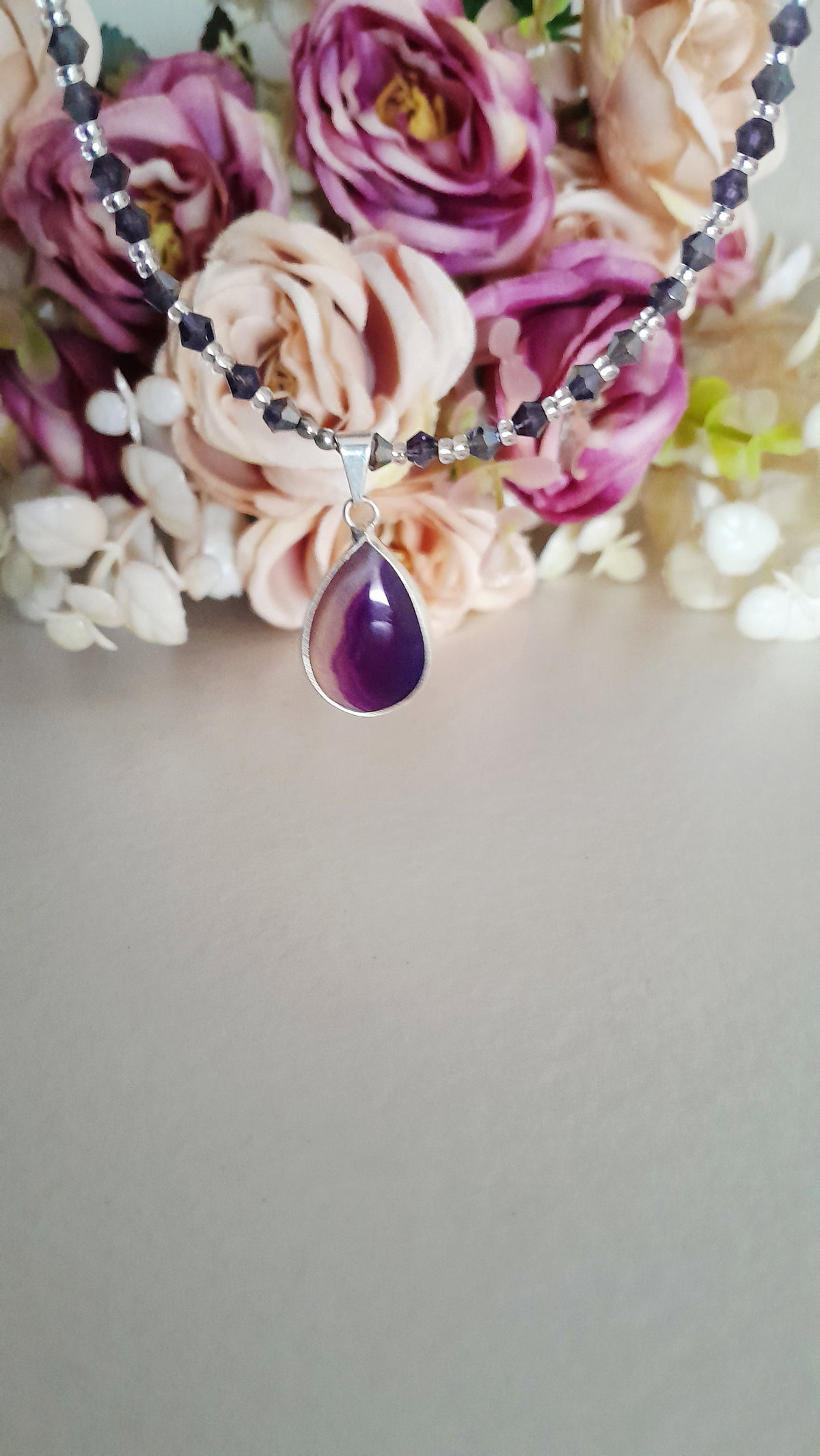 Collar de cristales y dije de piedra Ágata , 40 cm de largo aproximadamente, más cadena de extensión, cierre y cadena de acero quirúrgico
