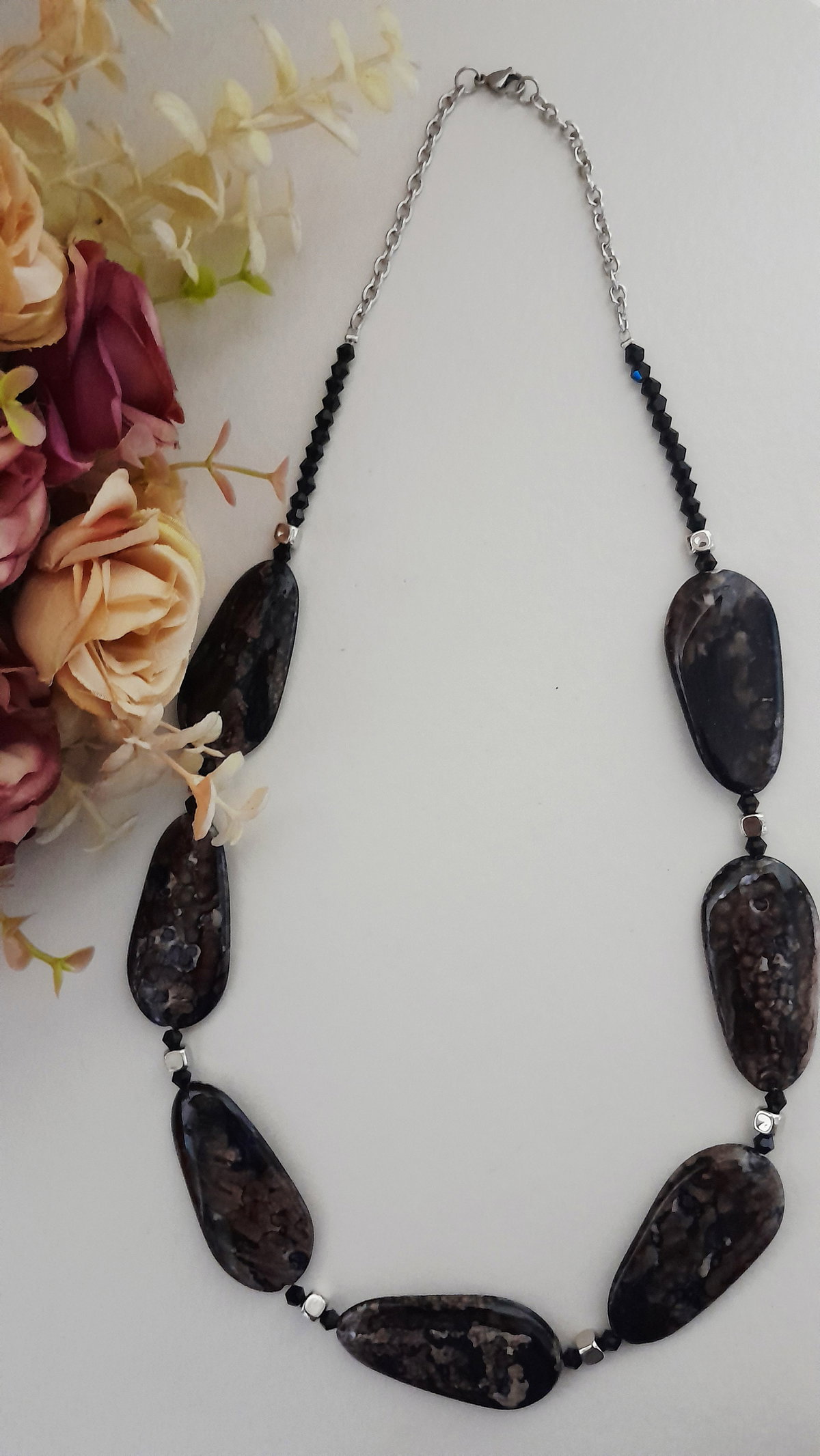 Collar de cristales, dijes de resina importada, de 64 cm de largo, cierre y cadena de acero quirúrgico.