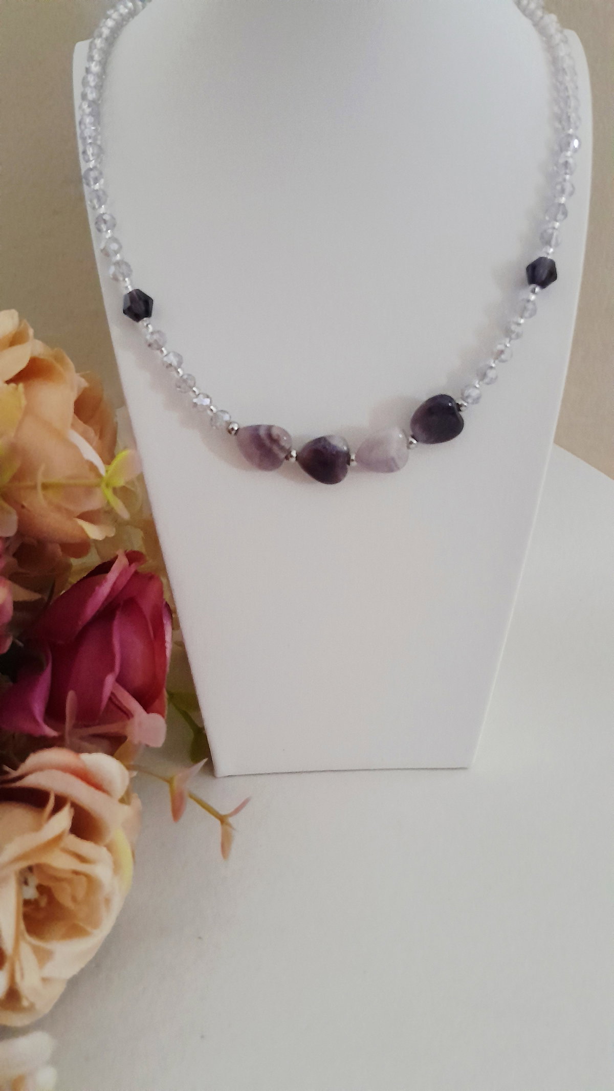 Collar de cristales y dije de piedra natura Amatista, 40 cm de largo aproximadamente, más 5 cm cadena de extensión, cierre y cadena de acero quirúrgico.