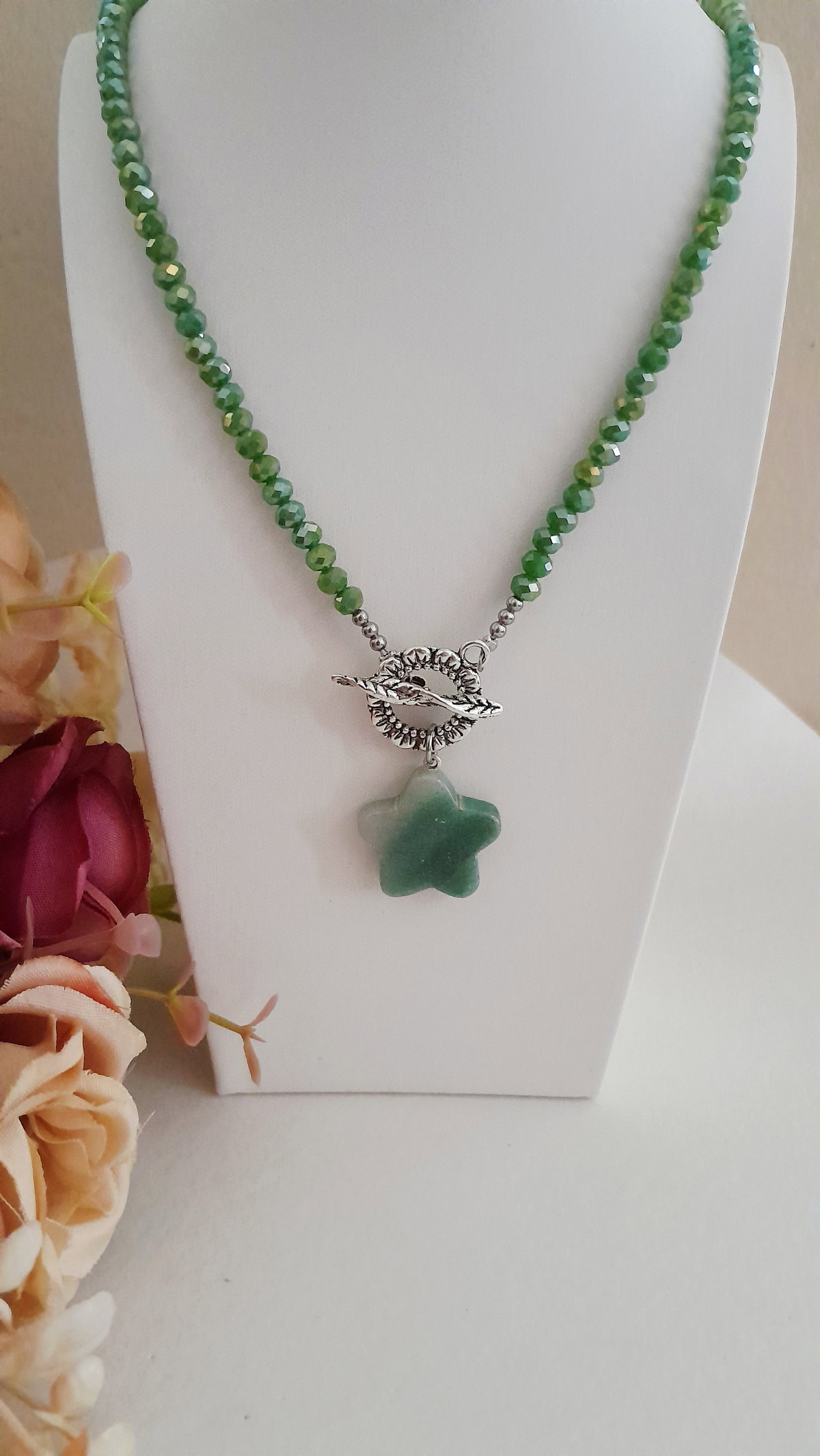 Collar de cristales y dije de piedra natura cuarzo verde, 45 cm de largo y cierre cruzado.