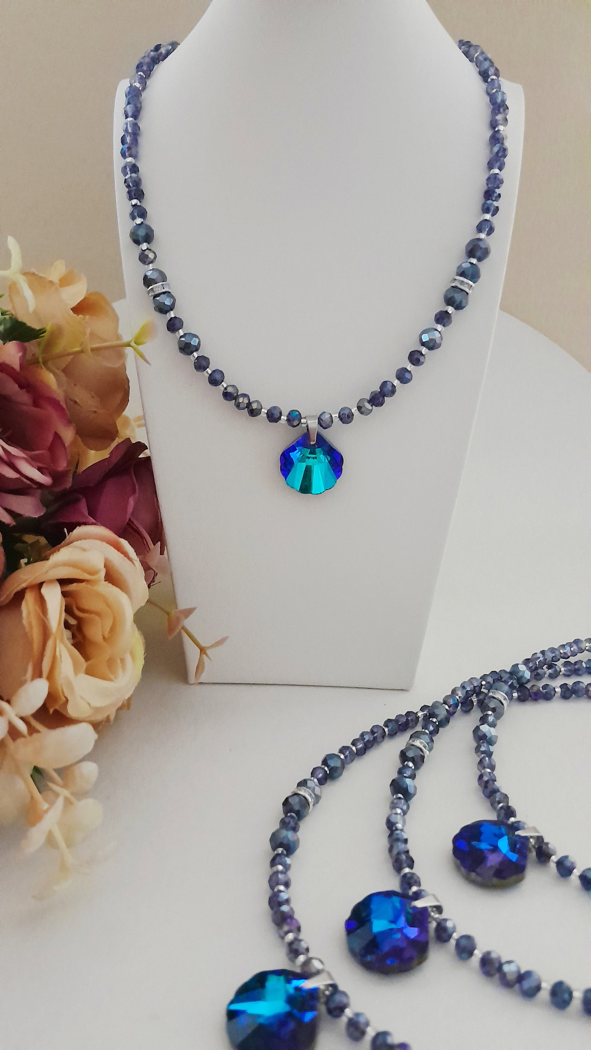 Collar de cristales y dije del mismo material, 40 cm de largo (más cadena de extensión de 5 cm) alargue y cierre de acero quirúrgico