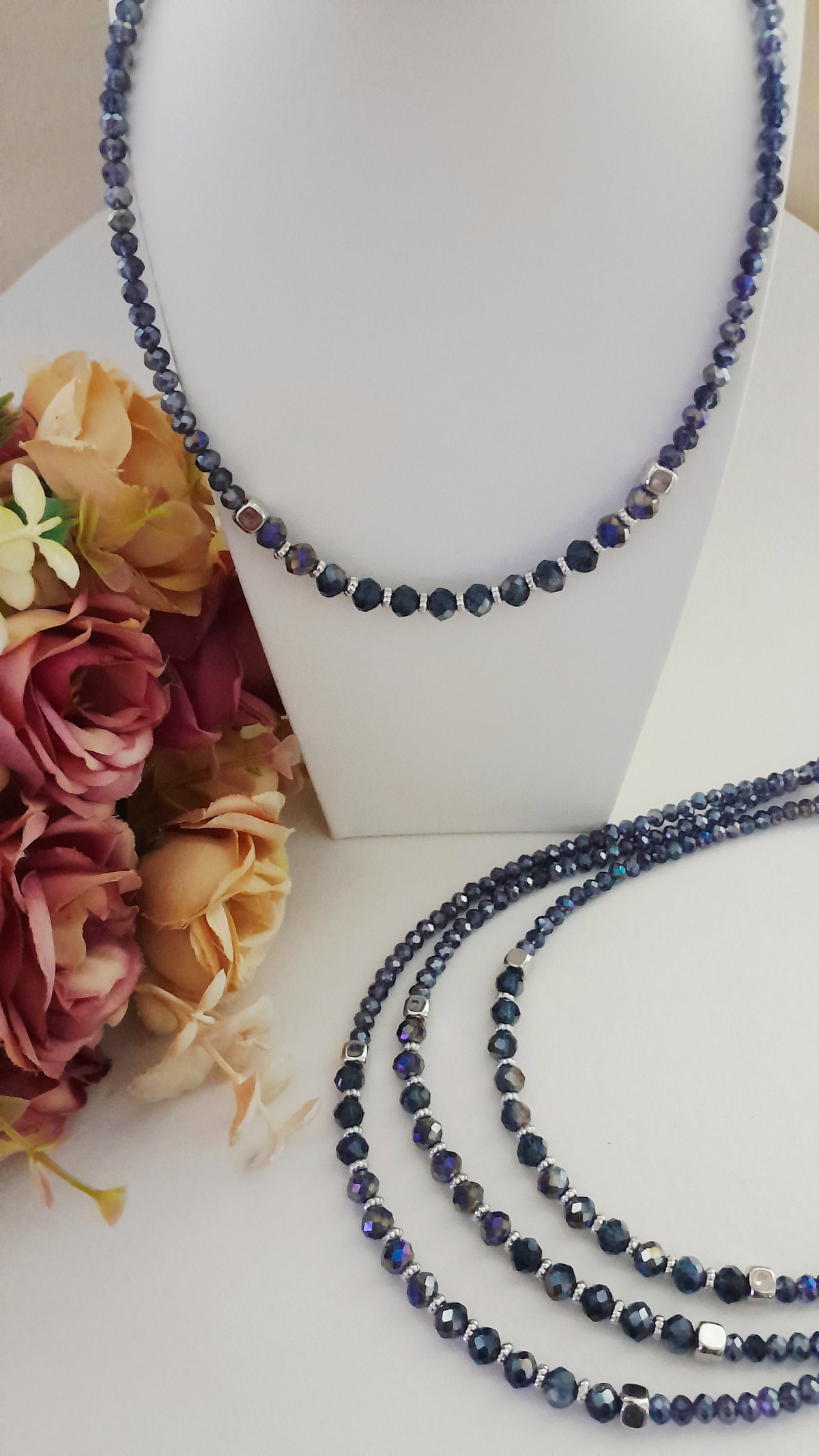 Collar de cristales de distintos tamaños de 45 cm de largo (más cadena de extensión de 5 cm) alargue y cierre de acero quirúrgico.